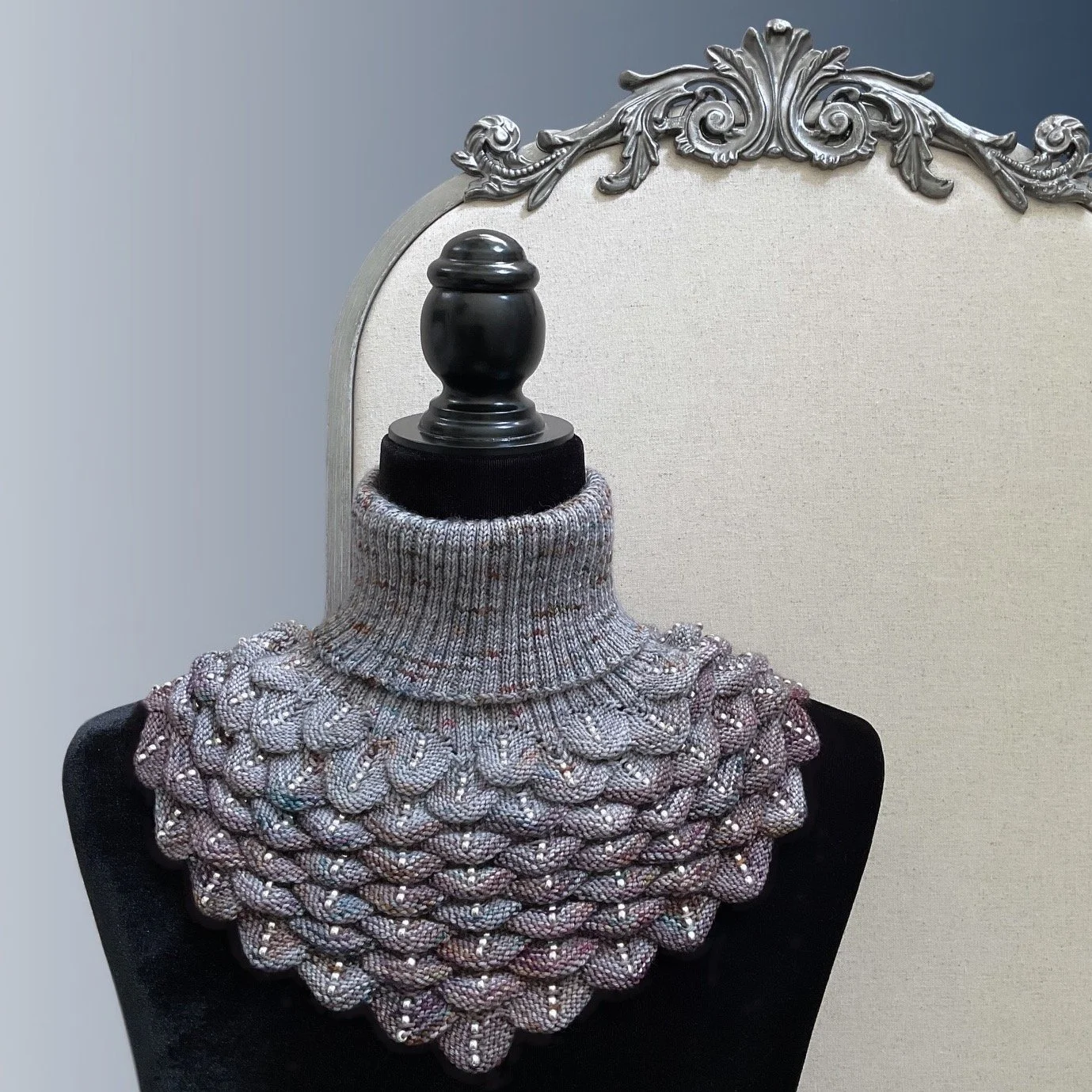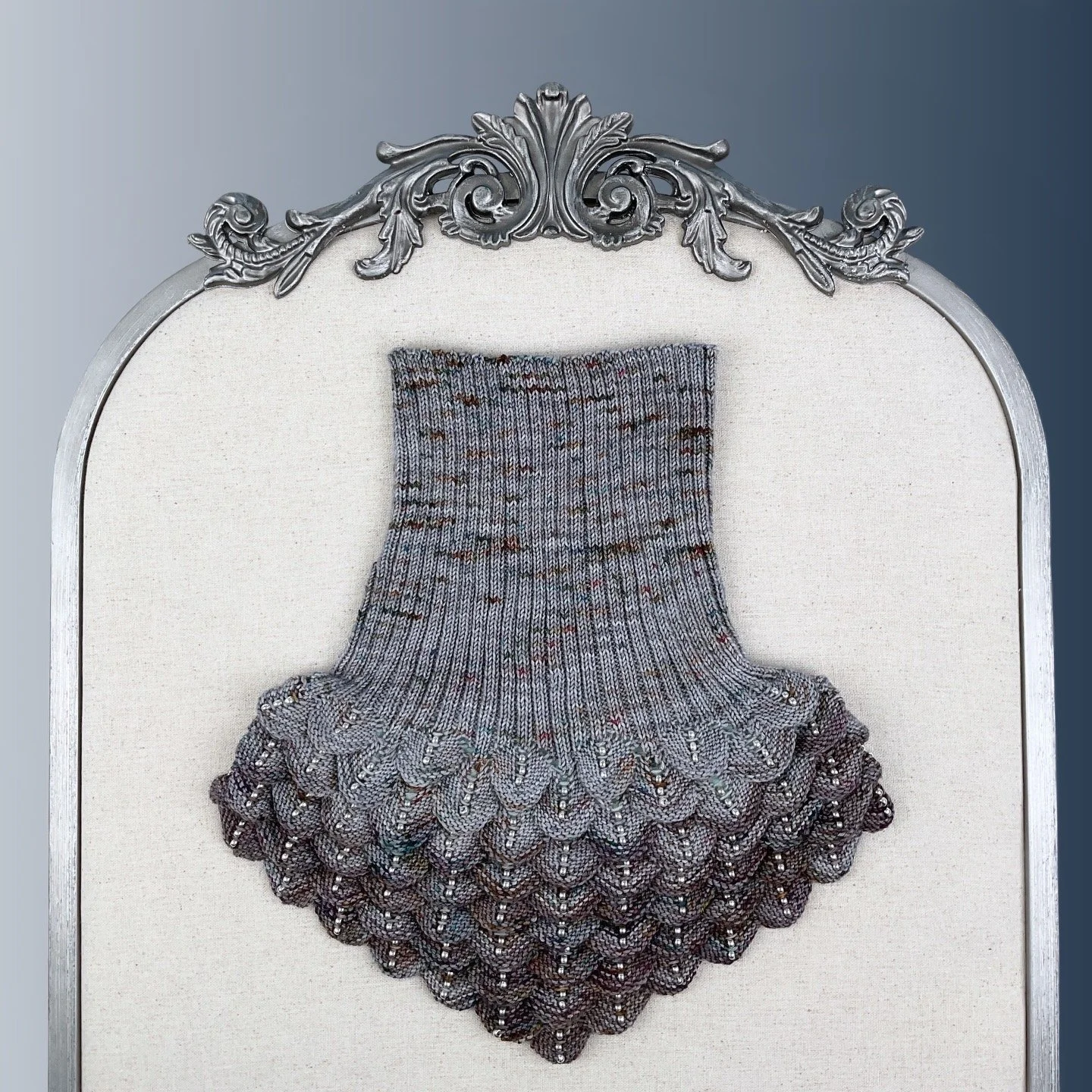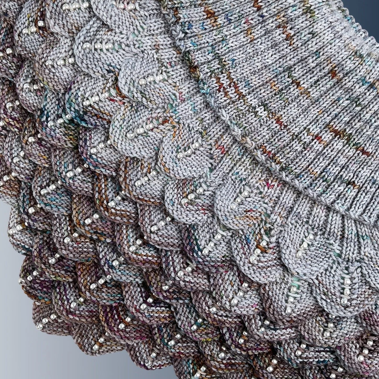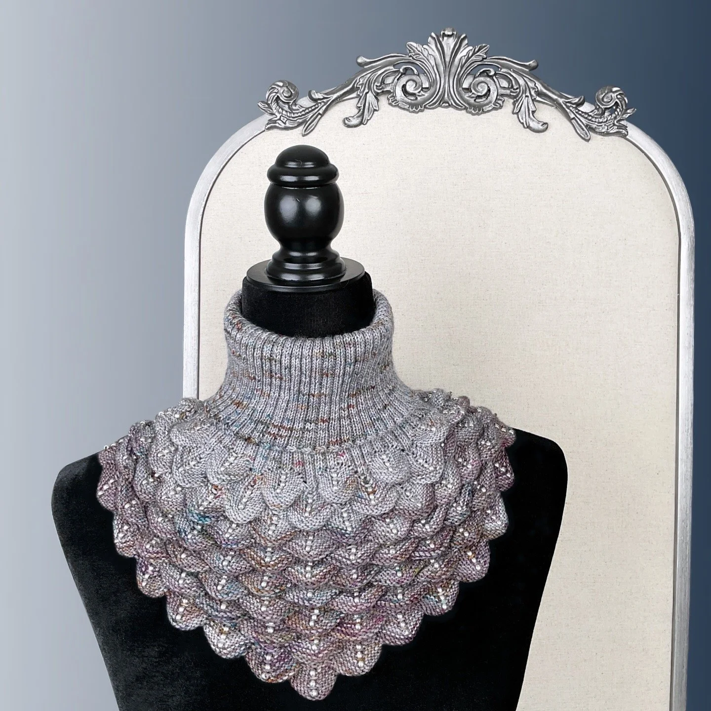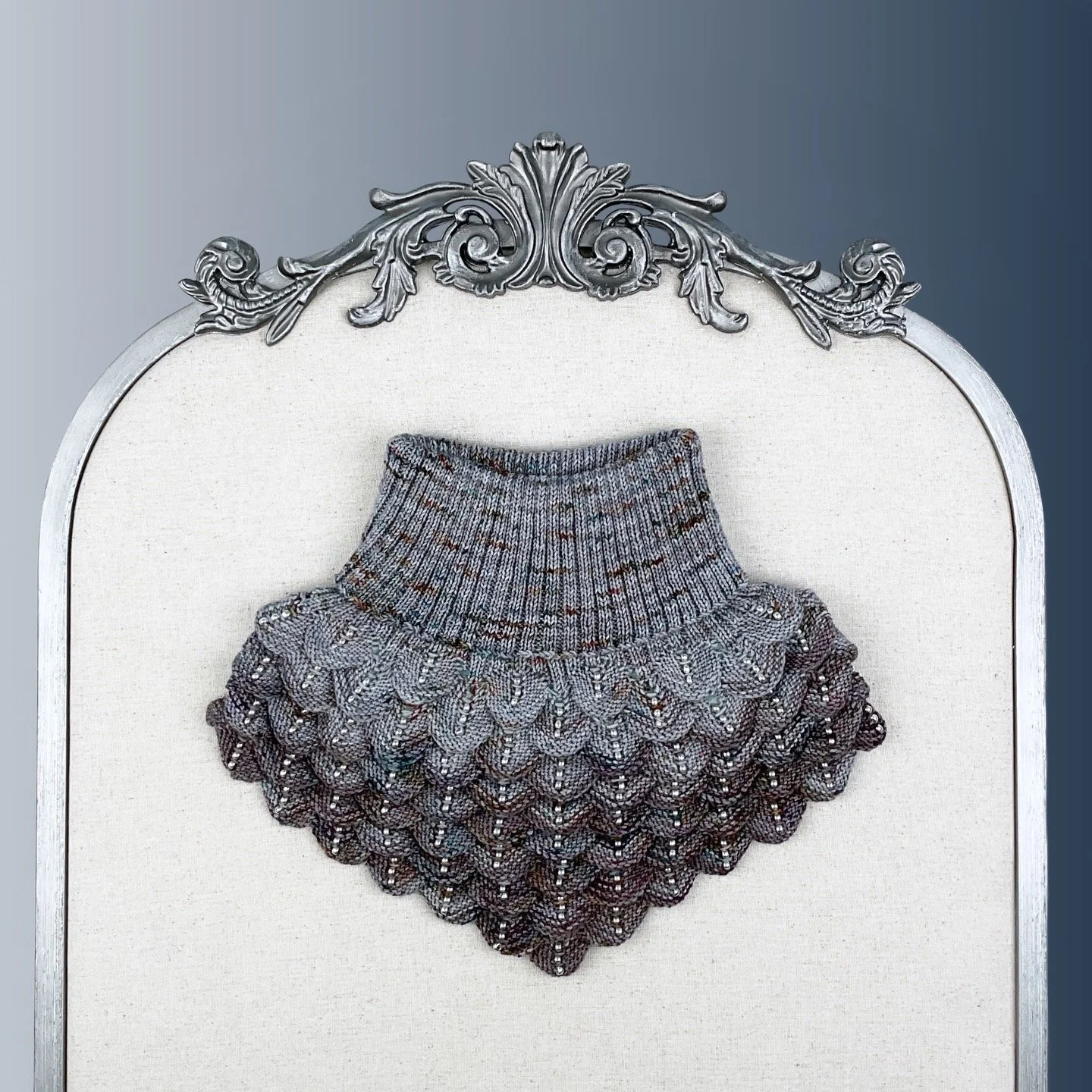 Dragon Rider is a unisex neck warmer inspired by medieval armor. Knit in the striking Smoke Quartz Haze fade set from La Bien Aimée, the colors transition seamlessly from shadowed depths through smoky mauves into silvery neutrals - like mist drifting across the sky.